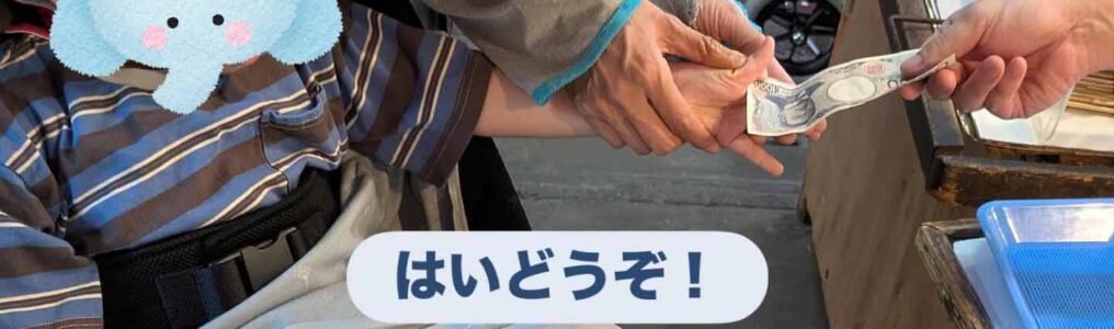 お買い物では職員から千円札を受け取り、お店の方へ「はいどうぞ」。